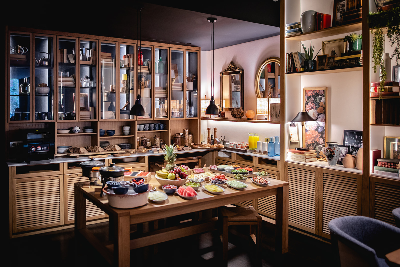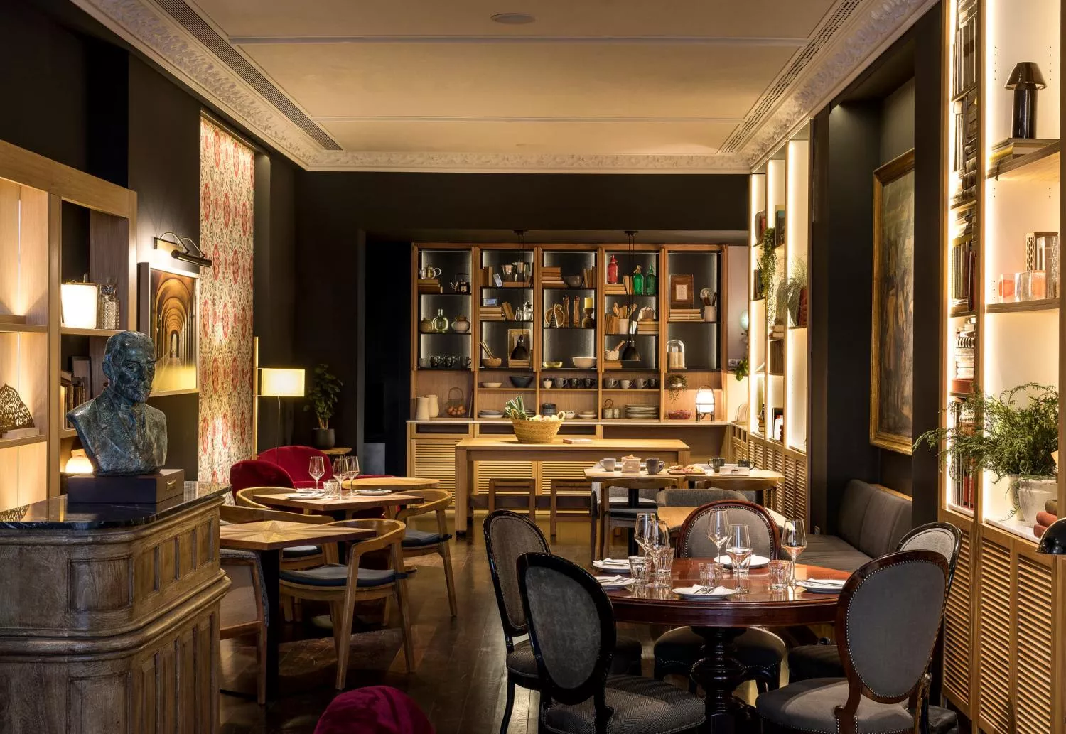 Upon entering the front door, the space opens out on both sides, leaving the reception in the centre. To the left is the bar area of Cafè de l’Arquitecte restaurant which boasts a spacious bar and views over the passageway. To the right is the lounge area of the restaurant, a welcoming sitting room with a fireplace, library and tables that offers a homely atmosphere.