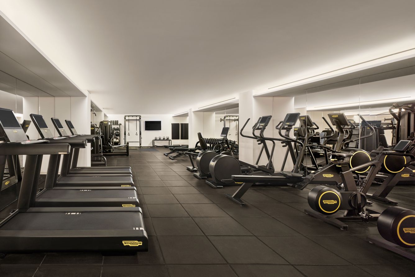 Modern training equipment, including cardio machines with built-in flat-screen TVs, free weights, a stretching space, and free towels, complete the wellness journey.
