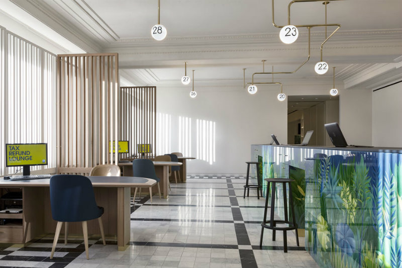This demonstrates Selfridges’ exceptional commitment to their International Customers providing a luxurious and comfortable environment where they process their taxes. The studio looked to the golden age of travel in the early 1900s when Selfridges opened, and the fashionable Palm Court restaurant that previously existed on the site. This influenced the reinstatement of the historic Selfridges detailing and scale of the rooms, including huge areas of hand painted glass and striking marble floors.