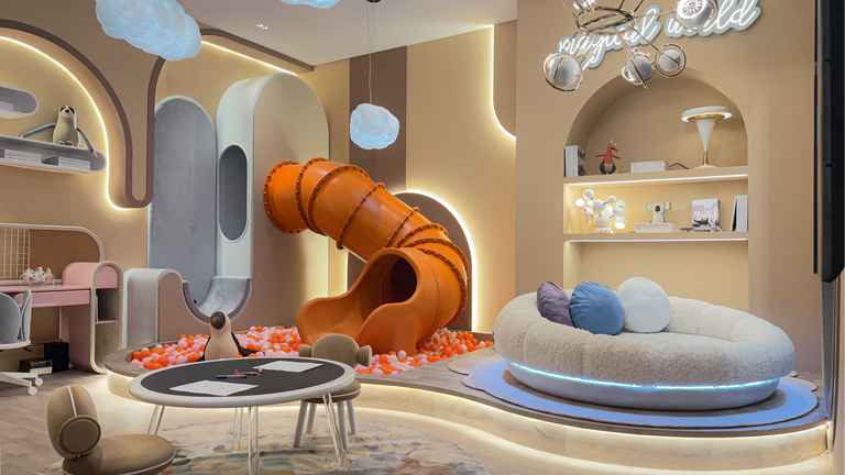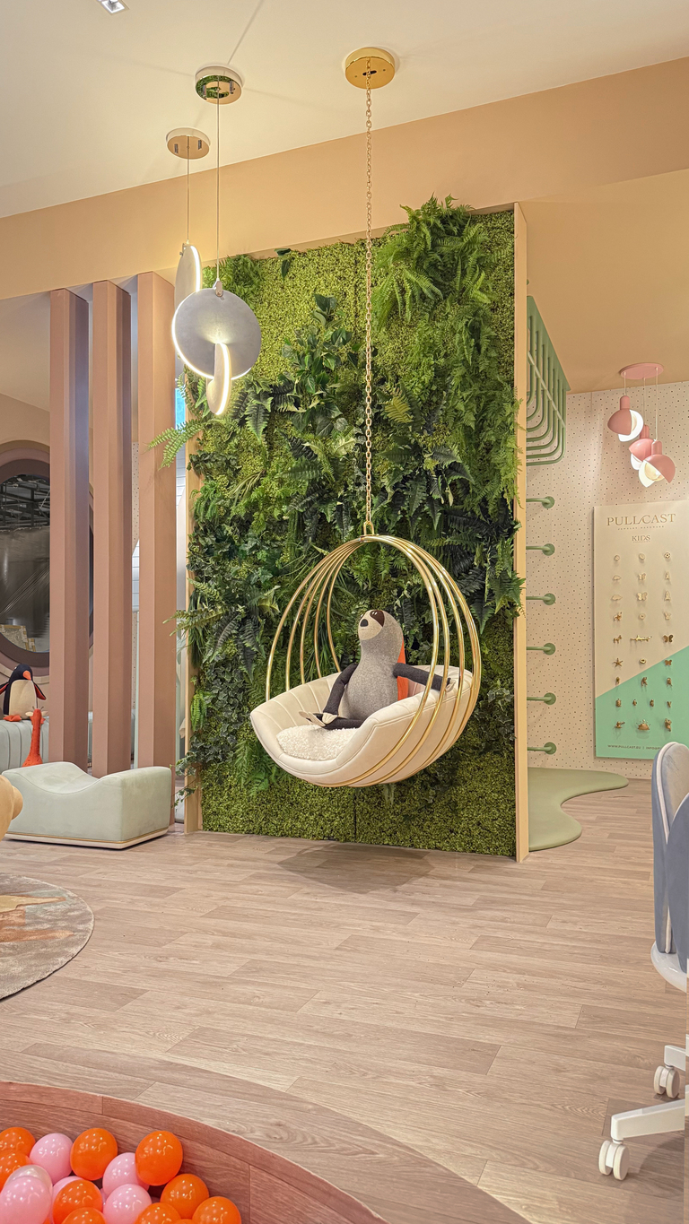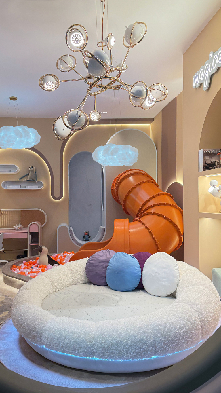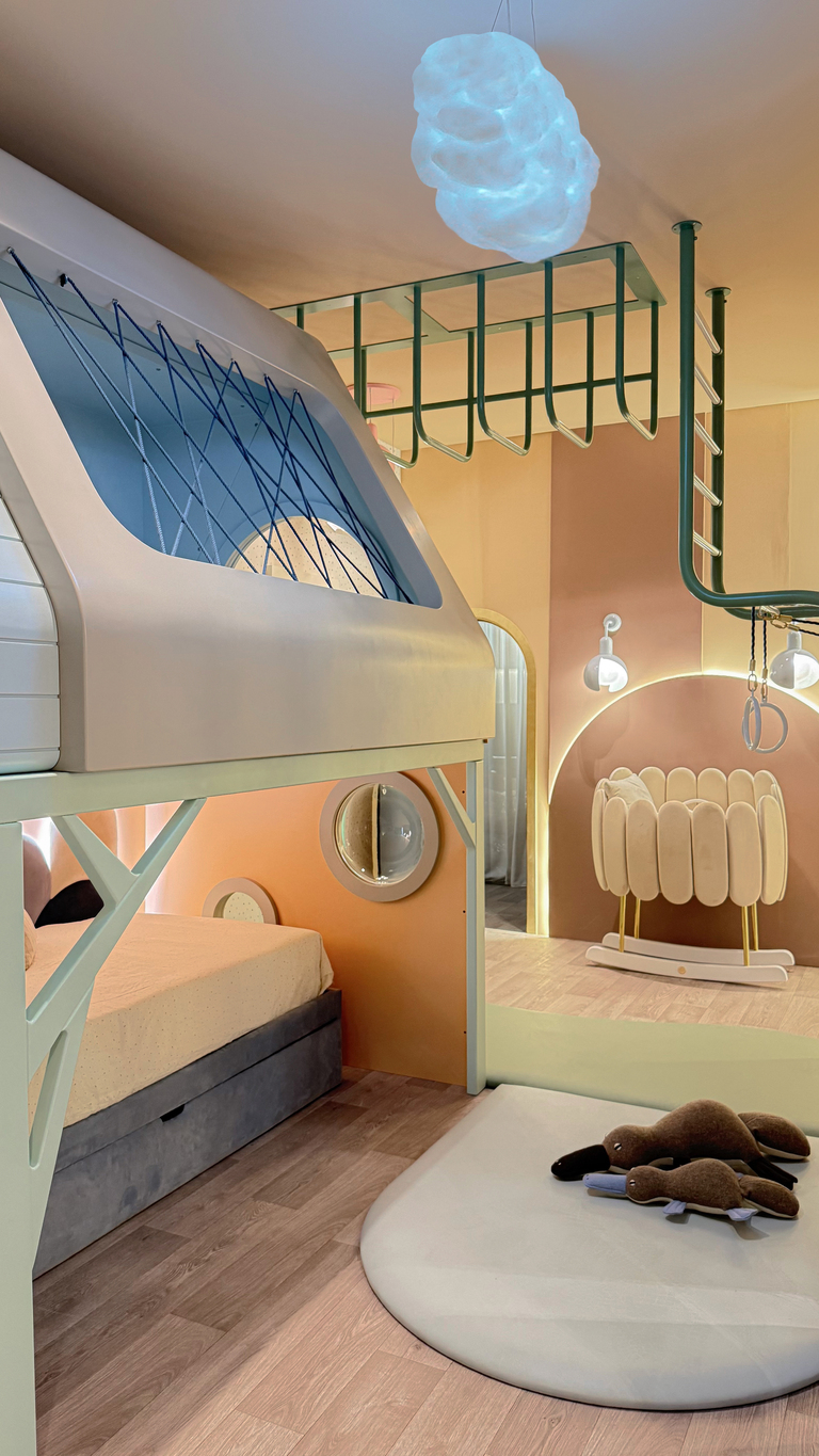 Lighting in kids’ interiors took on a narrative role this year. Fixtures resembled floating clouds, glowing moons, and abstract creatures, turning illumination into a source of wonder. Beyond aesthetics, there was a strong focus on adaptability, on lights that shift in tone and intensity to support everything from playtime to bedtime. Designers are clearly thinking about emotional rhythms, using light to help children transition through their day.
