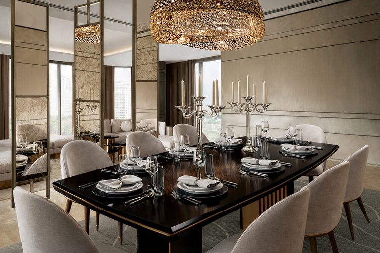 The dining room is a masterclass in understated opulence and refined geometry. At the heart of the space, the Beyond Dining Table serves that bit of drama while the velvety curves of the Imperfectio Dining Chairs provide a soft, tactile counterpoint to the table’s sharp lines. A textured Trinity Chandelier diffuses light through a honeycomb of brilliance. To the side, the Altura Mirrors create a sophisticated play of light and shadow, expanding the room’s horizons while maintaining an intimate feel. The composition is framed by a neutral, textured backdrop that allows the metallic accents and rich wood tones to resonate.