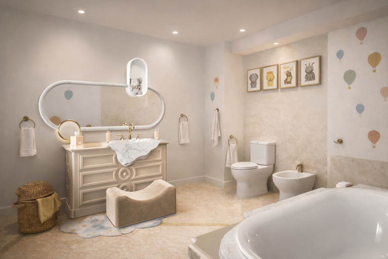 A gentle blend of charm and comfort, the children’s bathroom is designed as a soft, welcoming space that balances playfulness with thoughtful refinement. The bespoke vanity with its sculpted detailing and marble basin introduces a sense of elegance, while the Bubble Gum Big Mirror echoes a child-friendly sensibility. Delicate wall motifs and framed illustrations add a touch of whimsy, enlivening the space without overwhelming its serene palette.