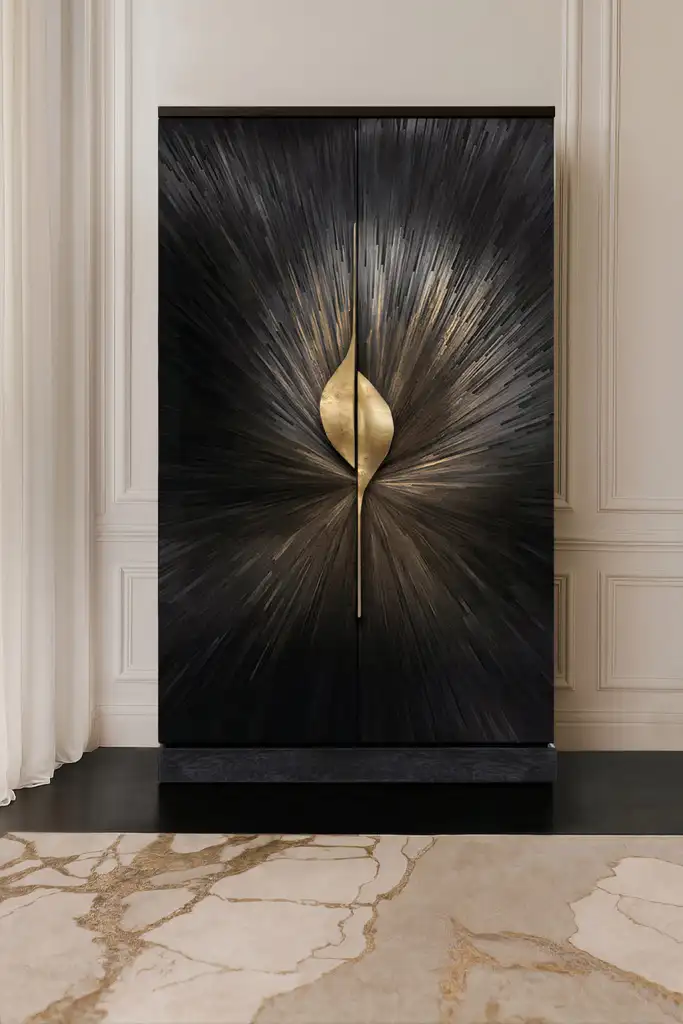 The feminine charm of KOKET’s Spellbound collection appears again, this time in a striking black lacquer finish. Set against crisp white walls and a modern black herringbone floor, the piece creates a bold, glamorous contrast that exudes elegance and confidence.