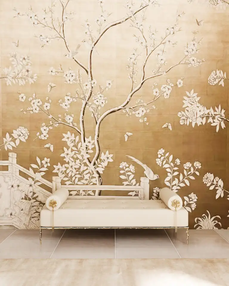 A bench is always a smart addition to a hallway, offering both functionality and style. In this whimsical entryway, gold and white wallpaper adorned with floral and animal motifs sets a playful yet refined tone. Placed in front, the Prive bench – with its sleek silhouette, nature-inspired cast brass frame, and jewel-like bolster pillows – adds an extra layer of charm and glamour.