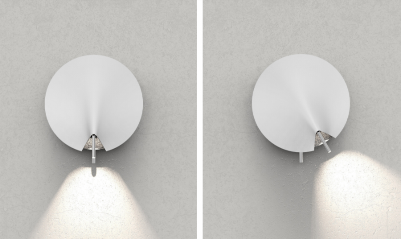 This outstanding wall lamp features round and soft lines that combine both the functions of a reading lamp as well as a table lamp. The shell evokes the fluidity of lifting a veil which reveals light. This element turns around a central axis for an intuitive and sensorial use. The axis also helps to guide the reading lamp. An independent and fixed backlight draws a halo of light along the periphery of the lamp which seems to take off from the wall to offer a misty aura.