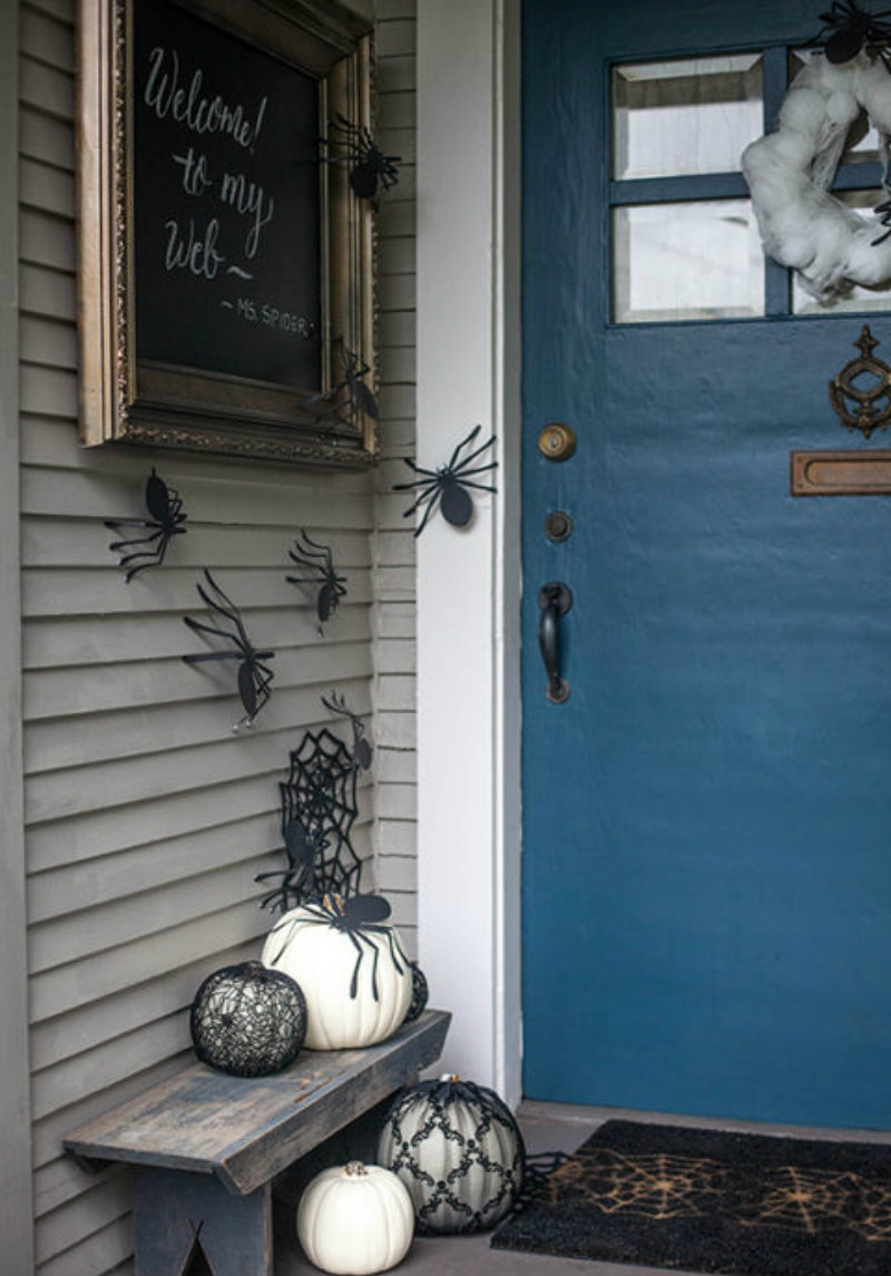 Black and white monogrammed decor along with spiders and cobwebs will create quite the creepy entrance.