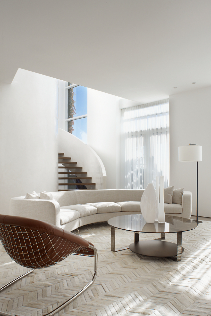 The interiors feature a soft, neutral colour palette accented by sculptural elements and natural material finishes, including a leather-finished, two-way Costa Azure marble fireplace in the main-level dining room and sculptural spiral staircase separating the living and dining areas.