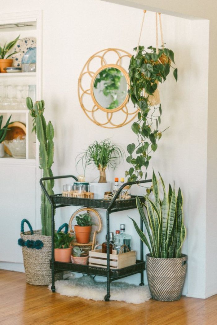 Plants everywhere! If you’re playing around with a black and white living room decor, a touch of green alongside a black bar cart is the perfect choice to complement the rest of the decor. It brings a special sense of comfort you’ll adore!