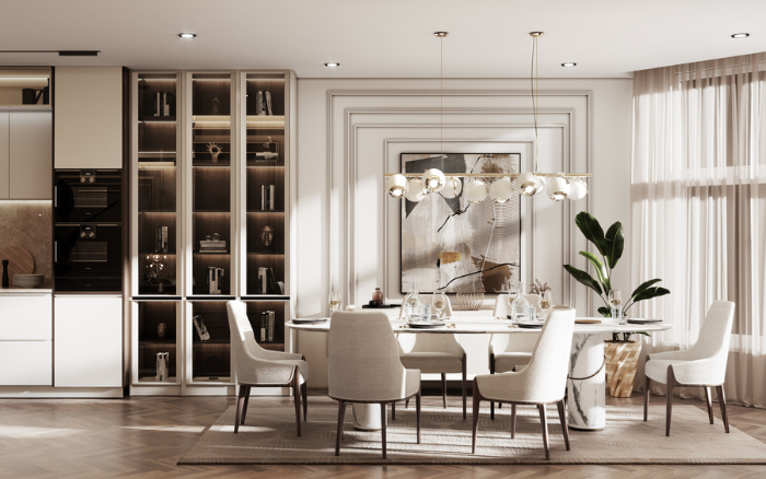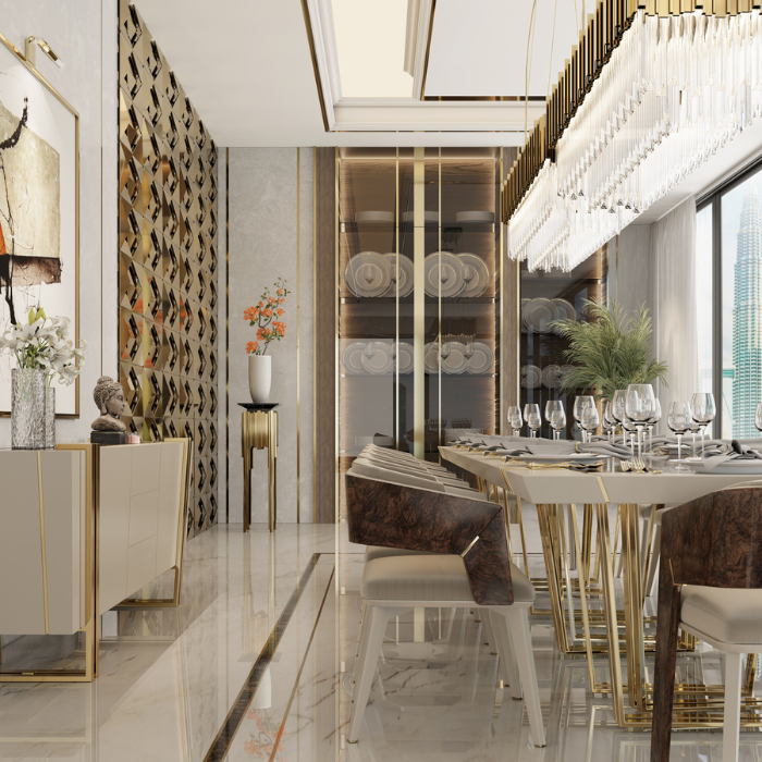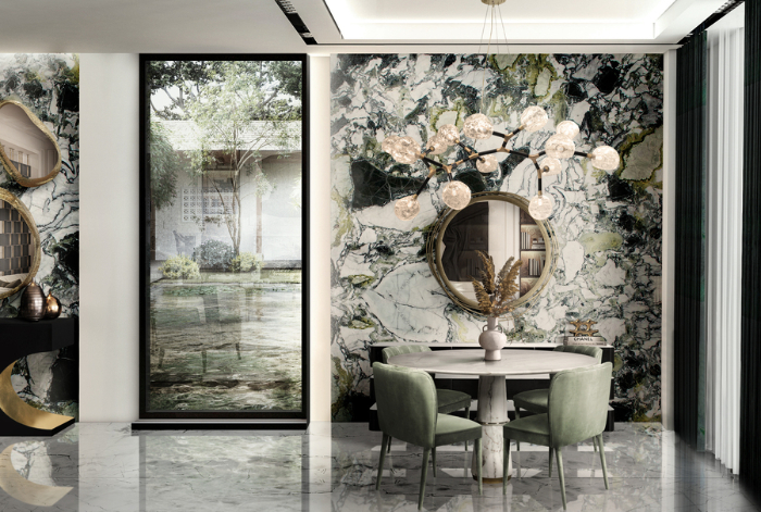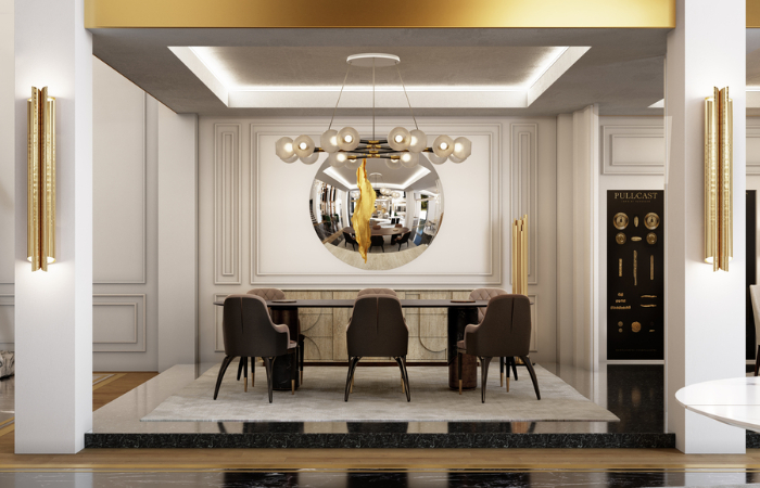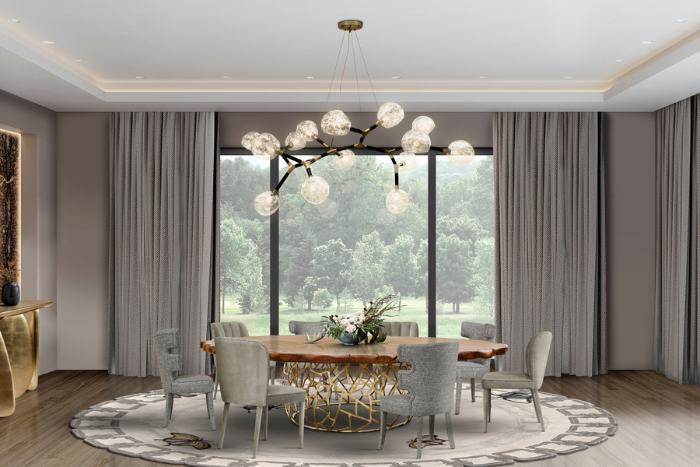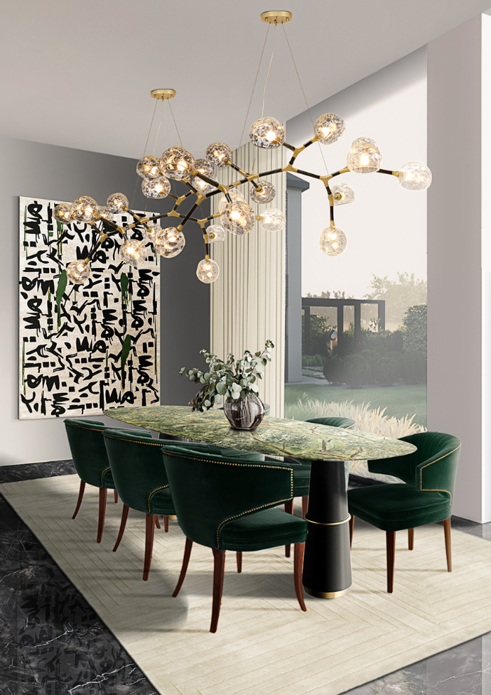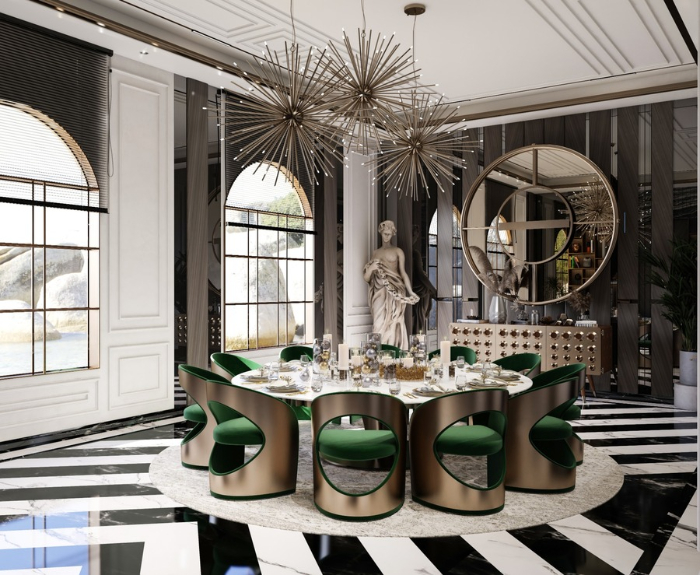 Luxury design is usually perceived with gold details all over. This dining room is the perfect example of luxurious design in different colours, which makes it completely different from what we are used to seeing.