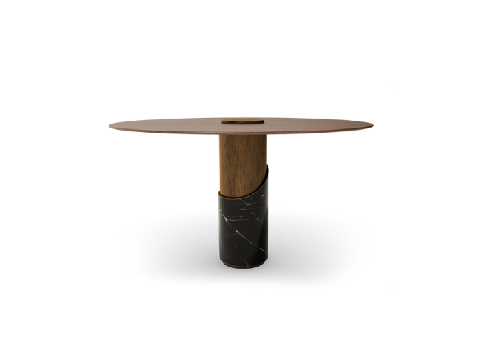 Breve is a strong coffee-based espresso drink mixed with steamed half-and-half milk. So, just like the exciting drink, this round dining table serves the same amount of glamour and flavour to any dining setting. A bold and dramatic leg gives an appealing look to the table, by organically mixing portoro marble with a chic brushed aged brass. The sleek and crafty round walnut top serves a modern character to the table. Breve Dining Table is also very versatile, where you can choose a white Olimpic marble as the main finish, to provide a richer and even more glamorous look.