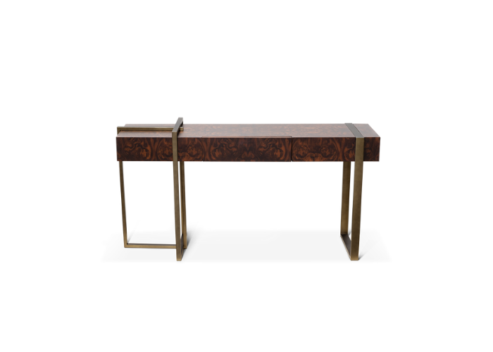 A refreshing, clean, and simplistic design, the Lungo Console‘s strict and harsh lines make it the sublime item for a modern interior. A subtle piece that doesn’t overpower or clashes with other designs, but still delivers a sense of splendour and taste, with the prolonged and thin stainless steel with brushed bronze finished legs, embracing a sleek and long Walnut Veneer.