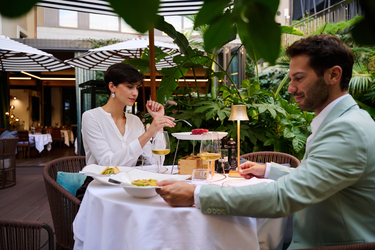 At the center of the hotel, an open-air courtyard acts as both a visual and social anchor. Inspired by the porticoed houses typical of old Milan, it reinterprets that tradition in a contemporary way. Several rooms overlook this internal space, reinforcing the feeling of being in a small, self-contained world. It’s here that the hotel becomes more outward-facing, with the restaurant and lounge bar opening directly onto the courtyard, blurring the boundary between interior and exterior. The restaurant, FORTE Garden, extends the hotel’s design philosophy into its culinary offering. The focus is on Mediterranean seafood traditions, presented with an emphasis on ingredient quality and clarity of flavor. The setting mirrors the rest of the hotel, making it as much a social space as a dining destination.