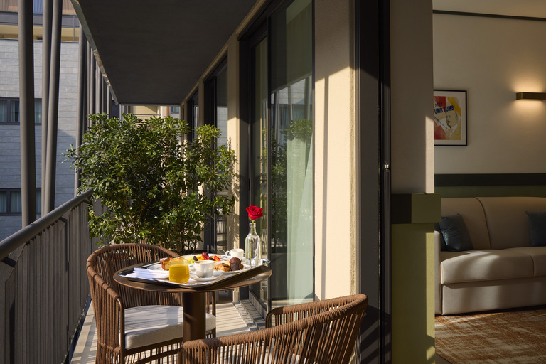 The 49 rooms and suites continue this dialogue between comfort and design precision. Each space feels composed rather than decorated. Furnishings are elegant but functional, with an emphasis on materials that invite touch, from smooth woods and soft textiles to carefully chosen finishes. What adds a layer of personality are the graphic artworks created specifically for the hotel by Drogheria Studio. These pieces reference Milan’s cultural landscape—fashion, music, design—without slipping into cliché, giving each room a subtle narrative connection to the city outside. Some rooms extend this experience further. The Milano Terrace Suites, with their generous private gardens, introduce an unexpected sense of openness in the middle of the city, while the Milano Suites frame panoramic views that remind guests of Milan’s layered urban fabric. Across all categories, the emphasis remains consistent: clarity, calm, and a sense of considered space.